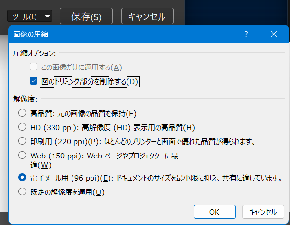 HOME > 日記 > PowerPointのデータ容量を減らしたい場合 2025/10/07 PowerPointのデータ容量を減らしたい場合 名前を付けて保存 ⇒ ツール ⇒ 画像の圧縮(電子メール用) パワーポイントに貼ってある画像そのもの解像度を低く設定してしまうので、保存時は、別名保存をしましょ。 パワポに貼ってある画像容量を減らせば、全体のデータ容量減るよね。 もちろん、画像が劣化するわけなので、画像の受け渡し目的なら電子メール用の設定は避けたがいいかな~ ■365日 記念日グッズを豊富なカラーと選べるサイズで、素敵な自分だけのオリジナルがきっと見つかる!シリーズ anniversary - by SUZURI ■プレゼントに何贈ろうか困ってるなら!年齢別学年別、変わり種の面白い贈り物 - おすすめあつめ。 スポンサーリンク スマホのみ下に表示 Twitter Facebook Google+ Pocket B!はてブ LINE